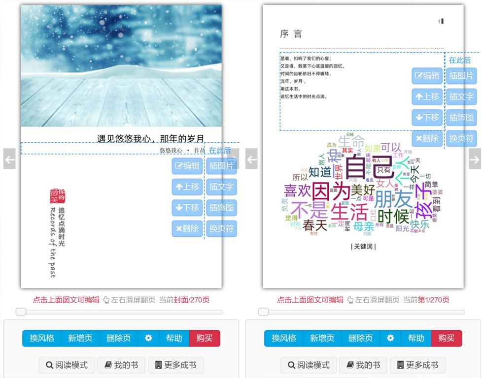 在线自编书和相册,自定义每一页内容,上传图片、文字,在线编排,实时浏览。可制作: